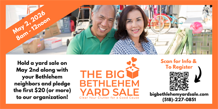 After the resounding success of last year's Big Bethlehem Yard Sale, we are back & bigger than ever in 2026! On Saturday, May 2, 2026 get ready for the Big Bethlehem Yard Sale from 8am-12pm. Our mission is to help Bethlehem residents come together as a community to raise money for charity by selling their clutter in a community wide yard sale. Register online to have your yard sale promoted on the digital map, then pledge the first $20 (or more) of your sales to one of the registered non-profits or shop treasures and second-hand finds all while supporting local non-profit organizations. Sign up to have the digital map emailed right to you so you’re ready for a day of deals.