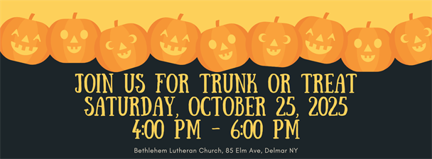 Trunk or Treat Cars, candy, community, and a bounce house. Join us for our Annual Trunk or Treat on Saturday, October 25th from 4:00 pm - 6:00 pm. Free admission! Set a Reminder Enter your email address below to receive a reminder message. Email address Select the amount of Days before the event -- Select Days Before Event -- 1 Day 2 Days 3 Days 1 Week Captcha Validation Please complete the Captcha Submit Date and Time Saturday Oct 25, 2025 4:00 PM - 6:00 PM EDT Location Bethlehem Lutheran Church 85 Elm Ave Delmar, NY 12054 Fees/Admission Free Set a Reminder Enter your email address below to receive a reminder message. Email address Select the amount of Days before the event -- Select Days Before Event -- 1 Day 2 Days 3 Days 1 Week Captcha Validation Please complete the Captcha Submit Share × Print Email Add to Calendar Facebook Twitter LinkedIn Tell a Friend × Select Calendar Type × Google Yahoo iCal (Outlook, Apple, or other)