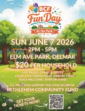 Join the Bethlehem Community Fund at the Bethlehem Town Park large pavilion on Sunday June 7th 2026 from 2pm-5pm for live music, face painting, a scavenger hunt, outdoor games, and a food truck! $20 per household & kids FREE. Leashed dogs welcome.
